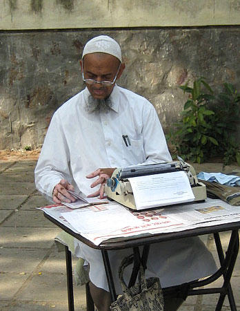 Серьезный мужчина у пакистанского посольства в Дели. Раньше его могли назвать оператором печатной машины. Или “тайпистом” — есть такое английское слово, мужской аналог машинистки. Короче, писарь.
