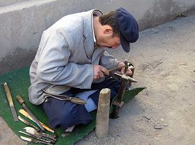 Эркин привез нас на фабрику, где ножи делают. Никаких цехов, станков, дымящих труб, которые я инстинктивно ожидал увидеть. Фабрика — совсем небольшое, полутемное помещение, в котором одновременно работали от силы человек шесть–семь. Вместо станков — несколько маленьких горнов, в которых жгли уголь, наковальни, за которыми работали сидя, единственная дань современности — круг для заточки клинков работал от электрического привода.
