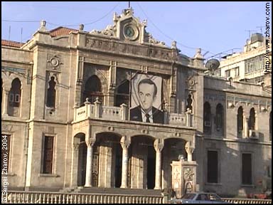 The train station in Damascus. With one train per week leaving it. The picture of late Hafez Assad still stays here because he is still loved by the population — notice the big heart around it.